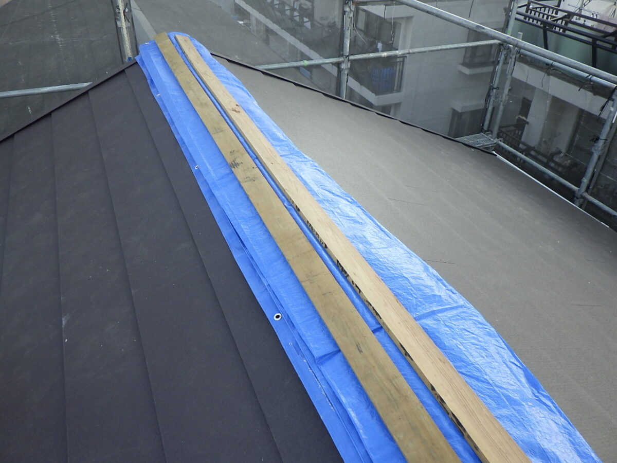 本日は仕上げまでいかなかったのでブルーシートで棟部分を養生しました。