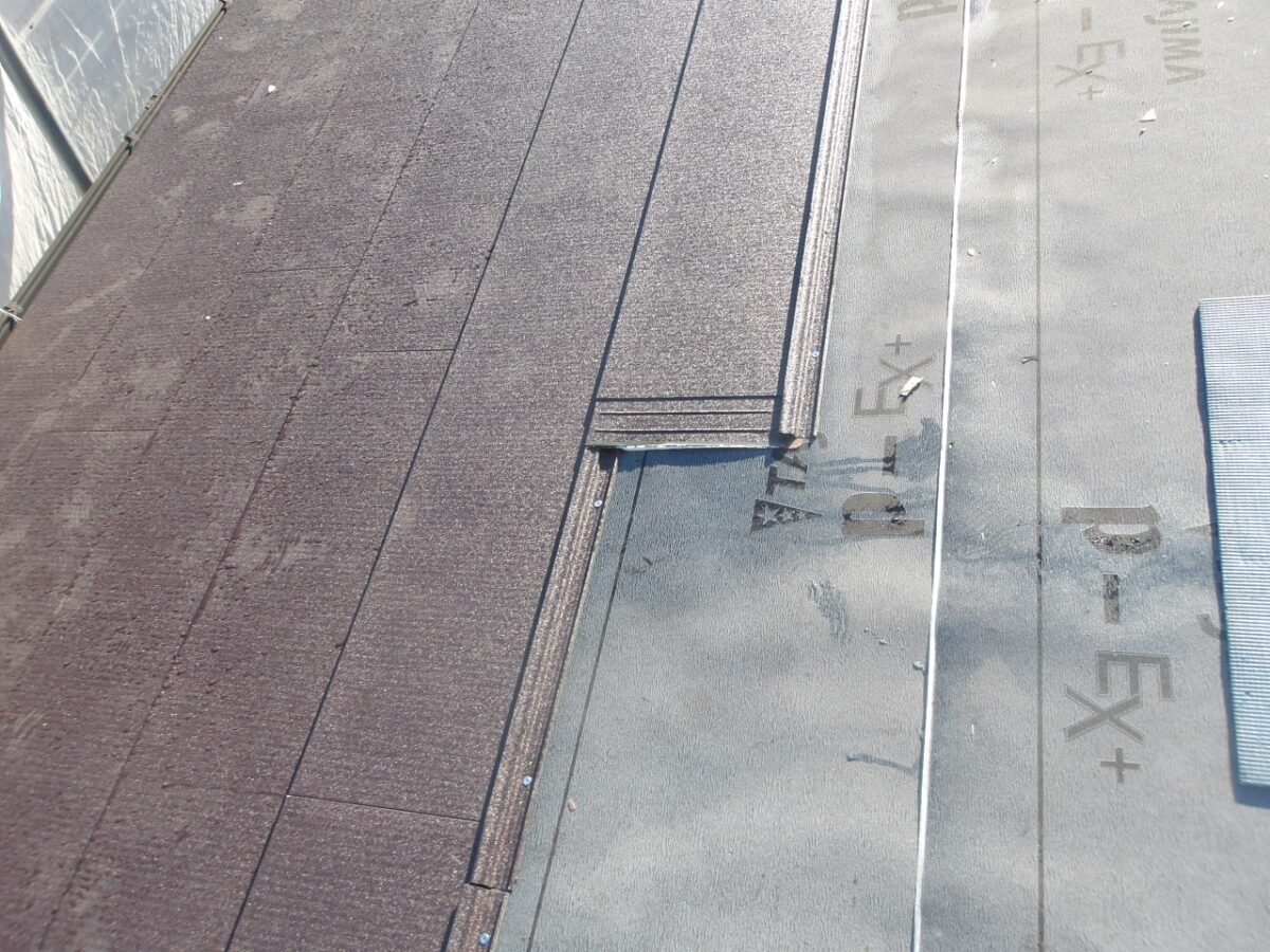 棟部分には60センチほど防水シートをカットして長さ90cmほどの自社オリジナル棟換気を取付けます。