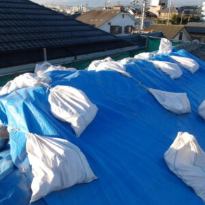 本日は足場設置と半面瓦めくり・土袋詰め作業までだったのでブルーシートで養生して帰りました。