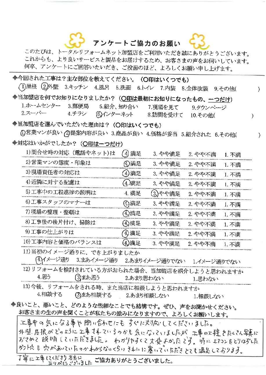 お客様の一言:工事中の気になる事や問い合わせにもすぐに対応してくださいました。外壁、屋根がどのように工事されているのかも気になっていましたが、工事の工程をたくさん写真におさめて説明していただきました。わかりやすくて大変よかったです。特にエアコンをとりはずしたダクト穴も穴があいていたのかわからないぐらいきれいに塞いでいただきとても満足しております。